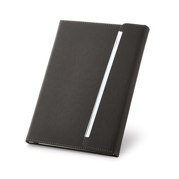 Caderno personalizado com capa dura em couro sintético com 96 folhas não pautadas na cor marfim, capa e contracapa em material sintético, porta caneta e lapela com fecho magnéticol.